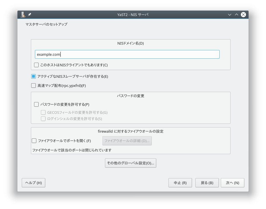 YaST で NIS サーバの機能を管理したい場合は、 root で zypper in yast2-nis-server コマンドを実行して、 yast2-nis-server パッケージをインストールしてください。お使いのネットワーク内に NIS マスターサーバを配置するには、下記の手順を実施します: